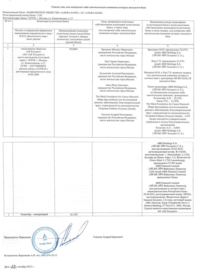 «Давая разрешение на создание российского финансового монстра, руководители НБУ почему-то не потрудились для перепроверки информации зайти на сайт российского «Альфа-Банка», где в разделе данных об учредителях указано, что Михаил Фридман имеет гражданство Российской Федерации и проживет в городе Москва. Равно как и трое остальных акционеров банковской группы. Именно для Украины, похоже, создана легенда о люксембургском офисе «Альфа-Банк», а вот российская «Альфа» управляется на 99% российской компанией, о чем сообщается на сайте банк. Выступая в качестве адвоката «Альфа-банка» Валерия Гонтарева умолчала и о том, что акционера «Альфы» Петра Авена причисляют к друзьям Владимира Путина. Этот банкир не только сопровождает президента России в поездках, но и, как сообщает пресс-служба Кремля, обсуждает с главой государства работу «Альфа Банка»», - утверждает издание.