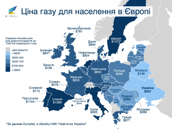 Розничная цена на газ для украинцев составляет 257 долларов (около 6,5 тыс. грн) за тысячу кубометров. Меньше в Европе платят за голубое топливо только белорусы – 146 долларов (почти 3,7 тыс. грн). А вот самая высокая цена в Швеции – 1372 доллара (34,5 тыс. грн). Однако стоит учесть, что и зарплаты в странах ЕС в несколько раз выше украинских, пишет ua.today.