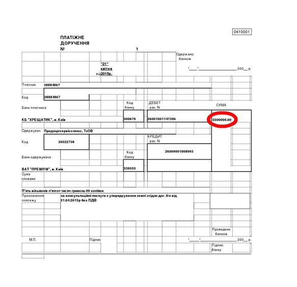 А вот еще один эпизод оффшорных махинаций «Мрии». 21 апреля 2015 фирма «Ридни ланы» (теперь - «Урожайна нива»), которая входила в «Мрию» Агрохолинг на момент платежа, переводит сумму в почти 5.5 миллионов гривен на счет ООО «Продторгсервисплюс», которое находится в селе Шпитьки, Киевской области. Назначение платежа - «за консультационные услуги».