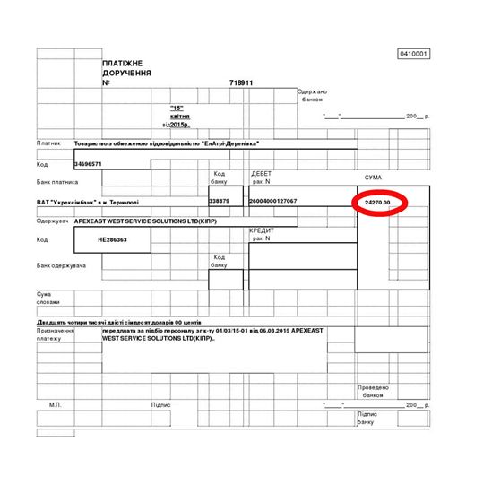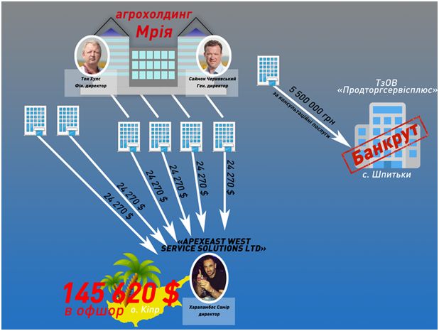 «Почти синхронно - 15-17 апреля 2015 года - все эти шесть вышеназванных фирм перечислили на Кипр компании уже знакомого нам Хараламбоса Самира «APEXEAST WEST SERVICE SOLUTIONS LTD» одинаковую сумму - по 24270 долларов каждая. Общая цифра в 145620 $ была перечислена за «подбор персонала». Также подозрительным является и тот факт, что сразу на 6-ти предприятиях в течение 2-х дней возникла такая срочная необходимость подбора персонала, и во всех шести случаях с одинаковой «платой» за услуги. Становится очевидно, что это банальная теневая схема по выводу средств руководством «Мрии» Агрохолдинг.