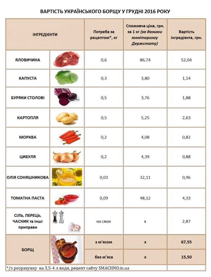 В декабря 2016 года стоимость кастрюли украинского борща объемом 3,5-4 литра составляла: с мясом - 67,55 гривны, без мяса (постный) - 15,50 гривны.
