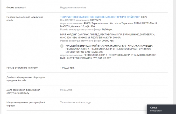 Среди учредителей ООО «Мрии Фарминг Тернополь» есть и ООО «Мрия Трейдинг», которая входит в скандально известный Агрохолдинг «Мрия». А вот конечный бенефициар - некий гражданин Кипра Кристакис Иаковидес, проживающий в Республике Кипр, город Лимассол, ул. Никоу Еггонопоулоу, дом 10Ф. По этому адресу зарегистрирована и ООО «Мрия Фарминг Тернополь».