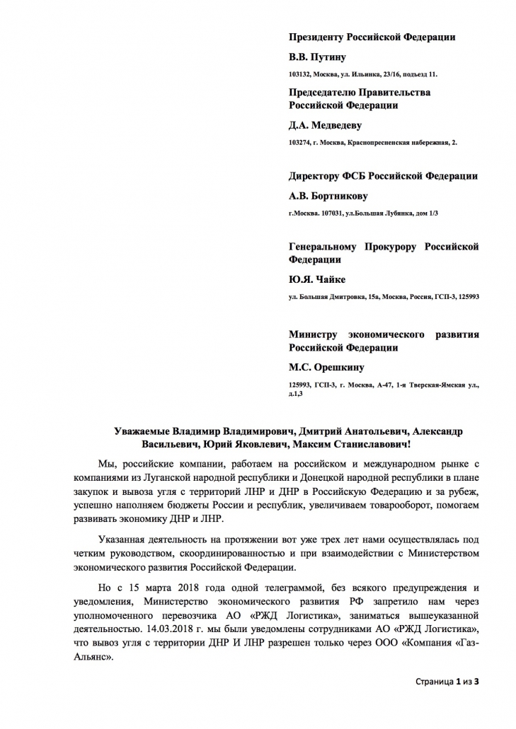 «Мы, российские компании, работаем на российском и международном рынке с компаниями из Луганской народной республики и Донецкой народной республики в плане закупок и вывоза угля с территорий ЛНР и ДНР в Российскую Федерацию и за рубеж, успешно наполняем бюджеты России и республик, увеличиваем товарооборот, помогаем развивать экономику ДНР и ЛНР. Но с 15 марта 2018 года одной телеграммой, без всякого предупреждения и уведомления, Министерство экономического развития РФ запретило нам через уполномоченного перевозчика АО «РЖД Логистика», заниматься вышеуказанной деятельностью. 14.03.2018 г. мы были уведомлены сотрудниками АО «РЖД Логистика», что вывоз угля с территории ДНР И ЛНР разрешен только через ООО «Компания «Газ- Альянс», - говорится в обращении, подписанном представителями 16 компаний.