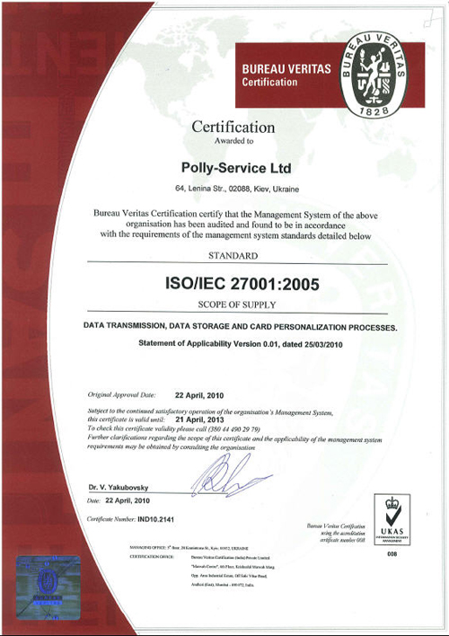 Следует отметить, что «Полли-Сервис» – первая компания в Украине, которая внедрила стандарт ISO 27001 для отрасли банковских карт и персонализации документов, что позволяет предложить сервис мирового стандарта как финансовому сектору, так и для международных проектов Консорциума «ЕДАПС». Сертификация была выполнена в рекордные сроки: при среднем сроке такого проекта 5-6 месяцев, специалисты компании «Полли-Сервис» завершили сертификацию всего за три месяца.