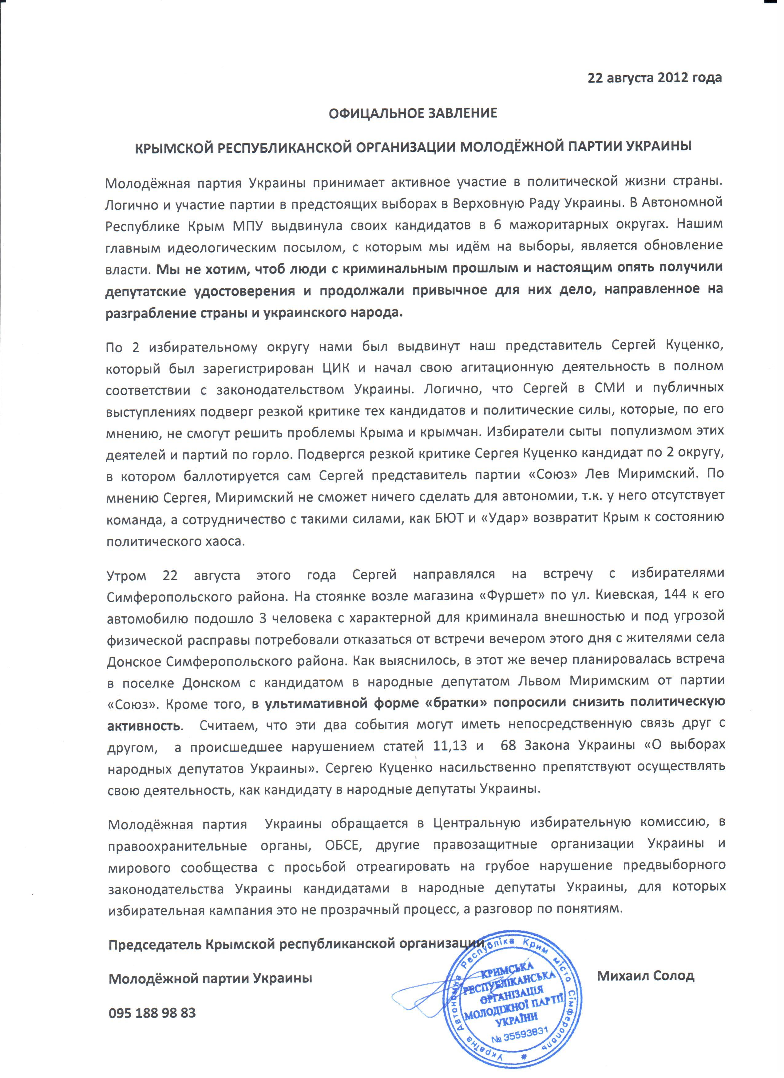 Молодёжная партия Украины выступила в защиту своего кандидата по избирательному округу номер 2 Сергея Куценко, сообщает «Чемодан компромата». Представители крымской ячейки партии считают, что угрозы физической расправы, которые были озвучены, их кандидату исходят со стороны людей нанятых Львом Миримским (партия «Союз»).