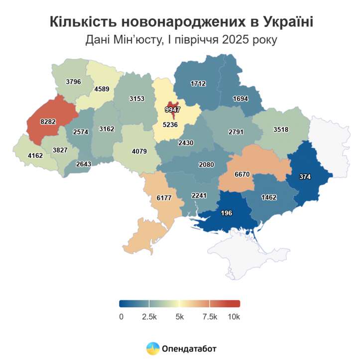 Найбільше дітей народжується в Києві (9 947 немовлят), на другому місці — Львівська область (8 282), третє займає Дніпропетровщина (6 670).