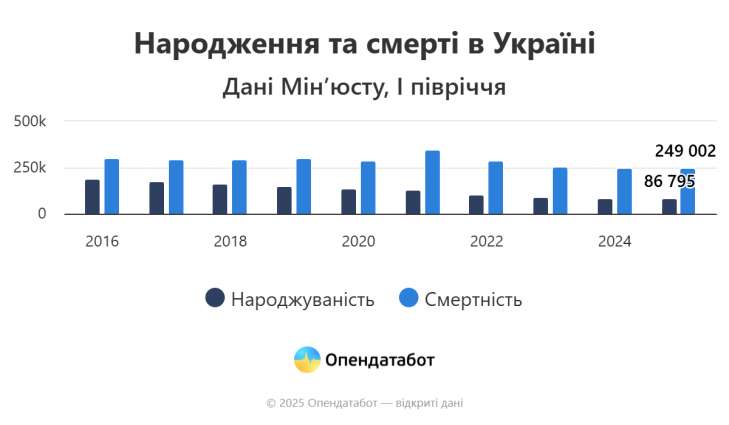 За перше півріччя 2025 року в Україні народилося 86 795 дітей, тоді як померли 249 002 людини. Таким чином, на кожного новонародженого припадає троє померлих — цей показник не змінюється вже п’ятий рік поспіль. Про це йдеться в аналітиці Опендатаботу.
