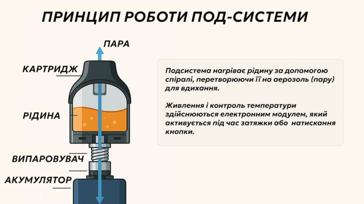 Пристрій призначений для випаровування рідини електронних сигарет. Ви заправляєте рідину у картридж пода, акумулятор подає енергію залежно від встановленого рівня і рідина перетворюється на пару.