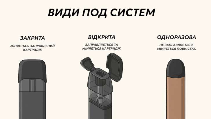 Відкриті поди (Open Pod System) У цих пристроях картриджі можна самостійно заправляти рідиною. В такому випадку можна мати великий вибір смаків.