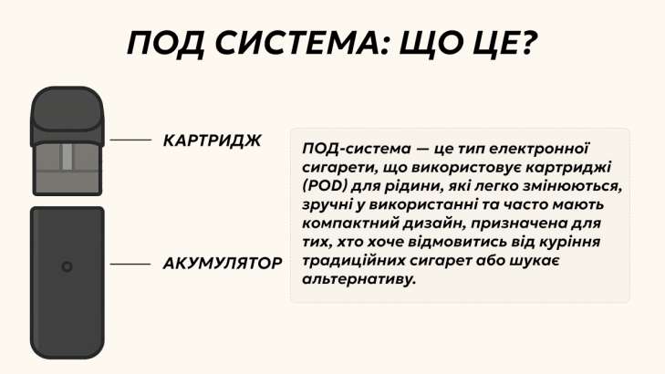Под система (від англ. pod system) — це вид електронної сигарети, яка складається з двох основних частин: акумулятору та змінного картриджа. Цей формат вейпу набув великої популярності завдяки своїй простоті, компактності та зручності у використанні.