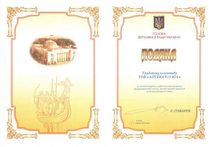 Напередодні новорічних свят трудовий колектив Аптечної мережі "9-1-1" отримав подяку Голови Верховної Ради України Руслана Стефанчука за значний внесок у забезпечення розвитку фармацевтичної галуз та за вагомі трудові здобутки в умовах воєнного часу.