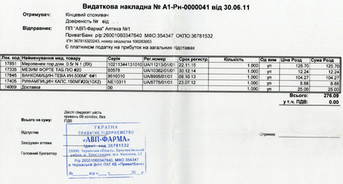 Курьер привез также и накладную с собой с указанием стоимости, названия, серии лекарств и даже сроком его регистрации.