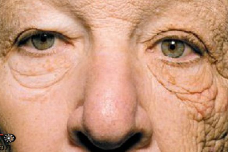 Левая сторона лица мужчины, как можно увидеть на фотографии, покрыта массивными морщинами. Медицинский осмотр показал, что у пациента гиперкератоз с многочисленными открытыми черными угрями, местами – узелковый эластоз (дегенеративное изменение эластической ткани).