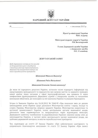 Депутат от «Свободы» отправил Раисе Богатыревой и Николаю Азарову запрос о неэффективных или коррупционных действиях Гослекслужбы, которые грозят детскими эпидемиями (документы – ниже).