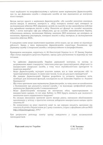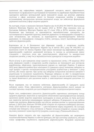 Речь в запросе идет о сложившейся ситуации в области иммунной безопасности нации, подвергающейся угрозе со стороны Государственной службы Украины по лекарственным средствам. Как сообщает народный депутат, с сентября 2012 года Гослекслужбой был наложен 21 временный запрет на использование вакцин на гораздо более продолжительные сроки, чем необходимо для проверки качества вакцин. По результатам проверок все запреты были сняты, что свидетельствует о нулевой эффективности работы службы.