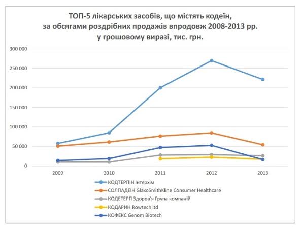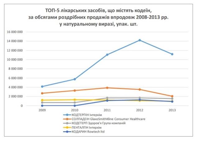 Среди наиболее популярных в Украине лекарственных средств, содержащих кодеин, оказались «Пенталгин» (ОДО "ИнтерХим"), «Солпадеин» (GlaxoSmithKline Consumer Healthcare), «Кодтерпин» (ОДО "ИнтерХим"), «Кодетерп» (ООО "ХФП "Здоровье народу") и «Кодарин» (Vivimed Labs Ltd для ROWTECH LTD). Причем розничная продажа «Кодтерпина» (ОДО "ИнтерХим") растет в геометрической прогрессии. Если в 2009 году было продано в розницу 4 млн. упаковок, то в 2012-м - 14 млн. В денежном выражении прибыль от продажи препарата за 2012-й составила более 250 млн грн. Безусловно, это лекарство является золотой жилой для фармацевтических компаний.