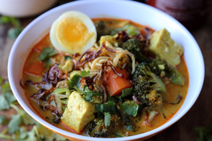 Нарезаем обсушенный тофу кубиками. В кастрюлю на среднем огне добавляем масло, чеснок и тофу. Варим 5 минут, до тех пор, пока тофу не станет слегка золотистым. Высыпаем брокколи и морковь и варим еще 3 минуты. Добавляем пасту карри, сам карри и воду. Мешаем, пока паста не растворится. Теперь – сахар и рыбный соус, кокосовое молоко.