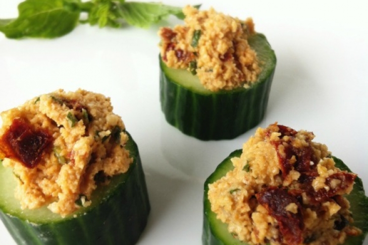 Кешью, соус, оливковое масло взбиваем в блендере. Помидоры и базилик мелко нарезаем и отправляем к орехам. Еще раз хорошенько перемешиваем до желаемой консистенции. Нарезаем кольцами огурцы, делаем в каждом ложбинку. Выкладываем по 1-2 ч.л. заправки и ... к столу!