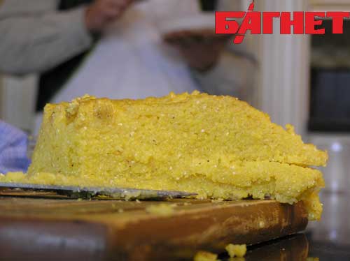 Виталий раскрывает мамалыгу и разрезает ее ниткой вдоль и поперек: «Большой грех разрезать мамалыгу ножом. Синтетическую нитку брать не советую, может расплавиться. Ведь в середине она еще очень горячая. Мы в детстве спорили, кто сможет разбить корж рукой. Дети обжигали себе руки, но все были довольны».