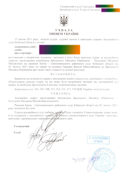 Напомним, суд первой инстанции признал клеветой все высказывания уполномоченного правительственного лжеца в адрес народного депутата Василия Грицака и обязал Михаила Бродского их опровергнуть. (см. документ)