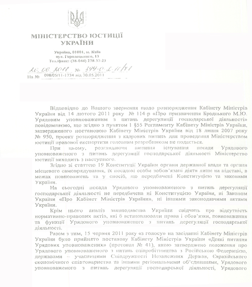 Как видим, в ответе на депутатский запрос за подписью министра Александра Лавриновича подтверждается сомнительный статус так называемого правительственного уполномоченного по вопросам дерегуляции хозяйственной деятельности. Во-первых, подобная должность не предусмотрена ни Конституцией, ни Законом «Про Кабинет Министров Украины», ни другими действующими нормативными актами.
