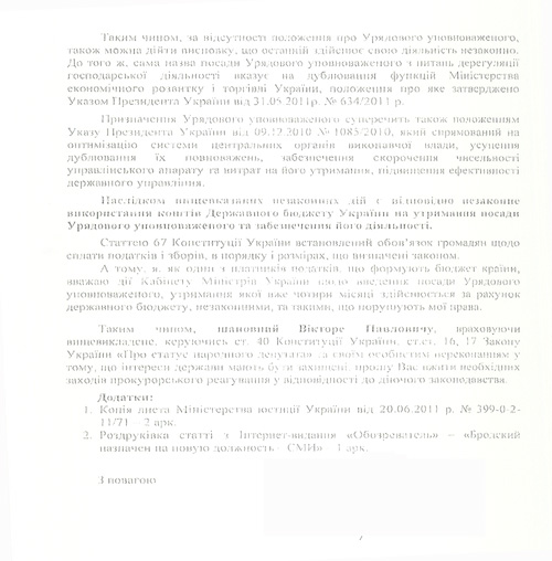 Более того, он считает, что назначение одиозного чиновника незаконно, поскольку противоречит ст.19 Конституции Украины и ЗУ «Про Кабинет Министров Украины». Также, сетует депутат, до настоящего времени на сайте правительства отсутствует какая-либо информация о так называемом уполномоченном, что не совпадает с принципом открытости деятельности членов кабмина и их готовности к обсуждению важных вопросов с общественностью.