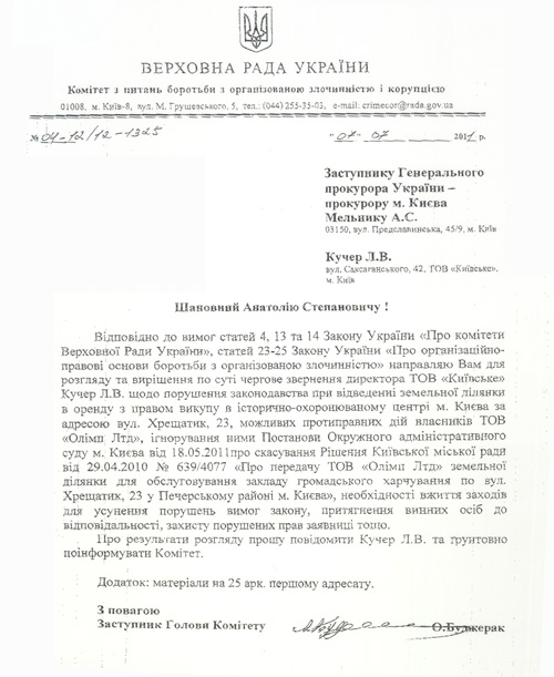 Перипетии и тяжбы, которые длились несколько лет, вылились в решение Окружного административного суда столицы в пользу ООО «Киевское» от 18 мая 2011-го. В нем значится, что ранее принятое Киевсоветом решение о передаче 840 кв.м. на Крещатике, 23, фирме родственников Бродского является незаконным, и для принятия указанного решения были использованы фальшивые документы. Что само по себе является достаточным для возбуждения уголовного дела основанием!