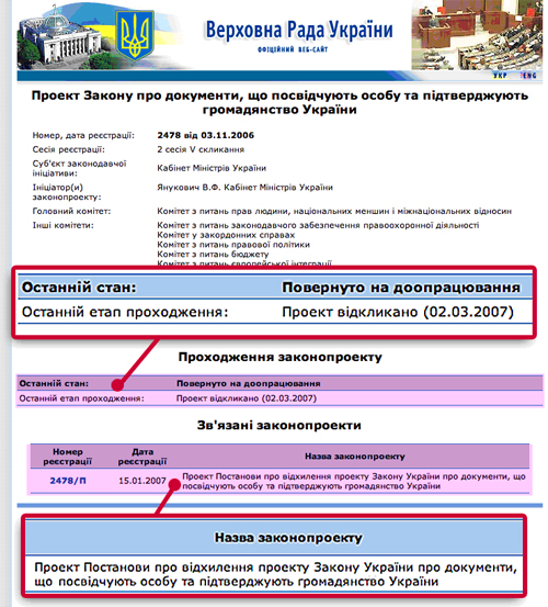 Фотокопия с сайта ВР Украины: законопроект Минюста о документах в 2007 г. уже отклонял парламент и отзывало правительство