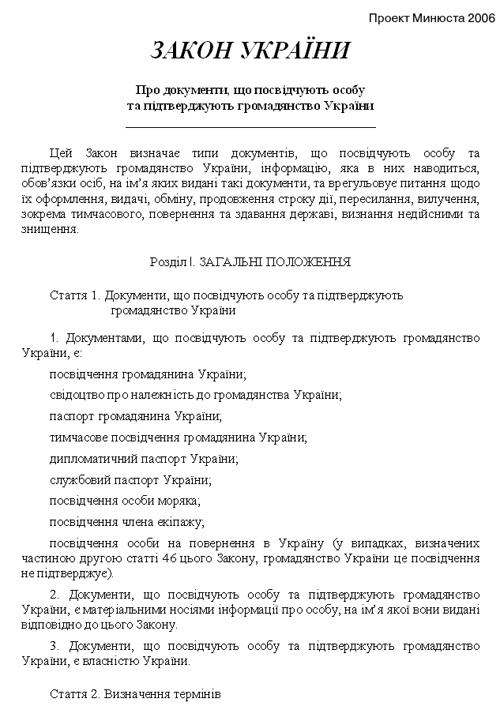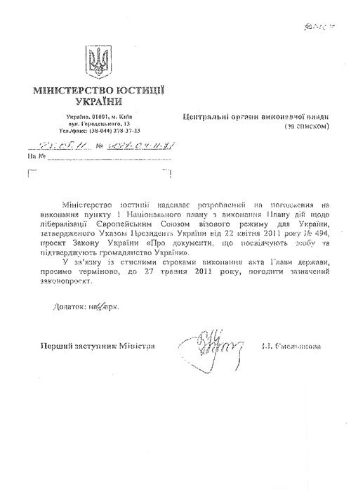 Лишним свидетельством того, что данный законопроект никем не рассматривался и не утверждался в законном порядке Кабмином (со всеми согласовательными процедурами и т.п.) является то, что в этот же день, 25 мая по центральным органам власти рассылается с сопроводительным письмом за подписью первого заместителя Министра юстиции И.И. Емельяновой законопроект «О документах, удостоверяющих личность подтверждающих гражданство Украины», в котором содержится указание «…срочно, до 27 мая 2011-го года согласовать разосланный законопроект» (см. документ).