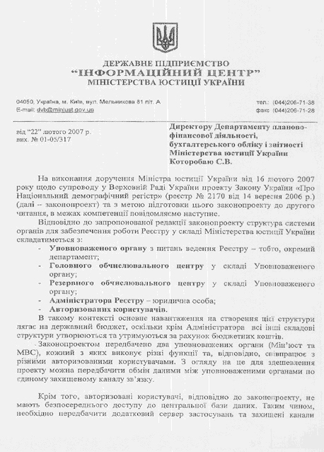 Госпредприятие «Информационный центр» Минюста, которое возглавляет ставленник А. Лавриновича В.Добжанский, подсчитало расходы. Вначале реализация законопроекта о демографическом регистре обошлось бы государству свыше 110 млн грн.: 40 млн грн. единоразовых затрат и 70 млн грн. ежегодных текущих. (см. фото)