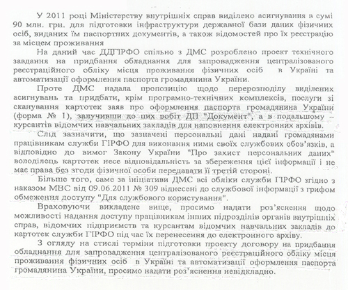 Кроме того, им необходимо приобрести программно-технические комплексы, услуги по сканированию карточек-заявлений на оформление паспортов гражданина Украина и (внимание) привлечь к этой работе ГП «Документ» и курсантов ведомственных вузов! Под незаконную «ручную» работу, через указанное госпредприятие, похоже, будут отмыты десятки миллионов гривен!