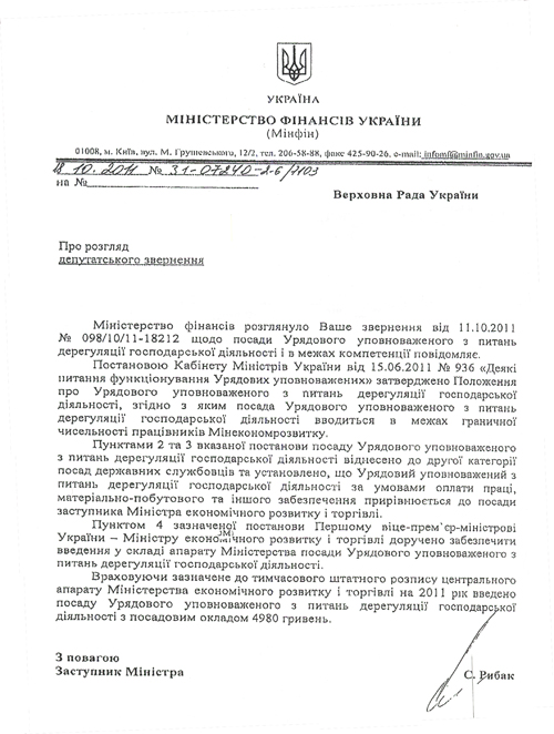 Итак, в распоряжении «Багнета» оказался любопытный документ. Один из народных депутатов решил поинтересоваться в Министерстве финансов, что за зверь такой – уполномоченный дерегулятор, сколько ему платят и какова его компетенция (см. фото документа ниже).