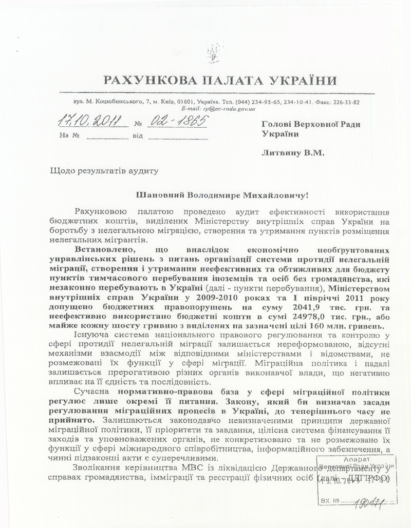 Согласно выводам Счетной палаты, существующая система контроля и противодействия нелегальной миграции до сих пор остается не реформированной, отсутствуют реальные механизмы взаимодействия между ответственными министерствами и ведомствами. Более того, похоже, никто и не думал приступать к выполнению задач Президента Украины и главы правительства, касающиеся формирования принципов государственной миграционной политики. Остаются не определенными ее приоритетные задачи, не разграничены функции, а принятые подзаконные акты являются сомнительными и противоречивыми (см. ниже фото документа).