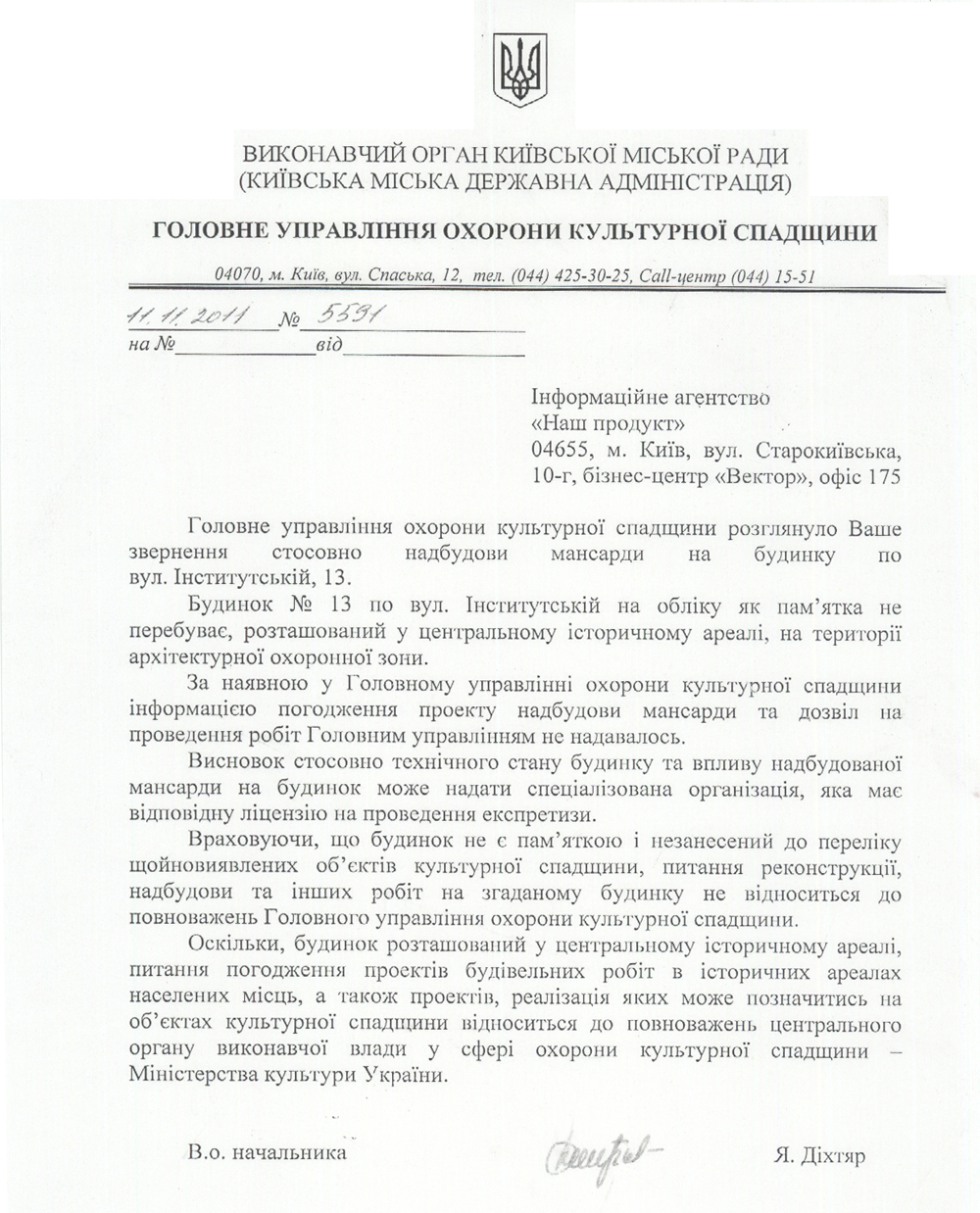 Информагентство «Наш продукт» получило ответ от Главного управления охраны культурного наследия насчет данного беспредела. «Согласно имеющейся в Главном управлении охраны культурного наследия информации, согласования проекта надстройки мансарды и разрешения на проведение работ Главным управлением не предоставлялось», - говорится в сообщении. (см. документ)