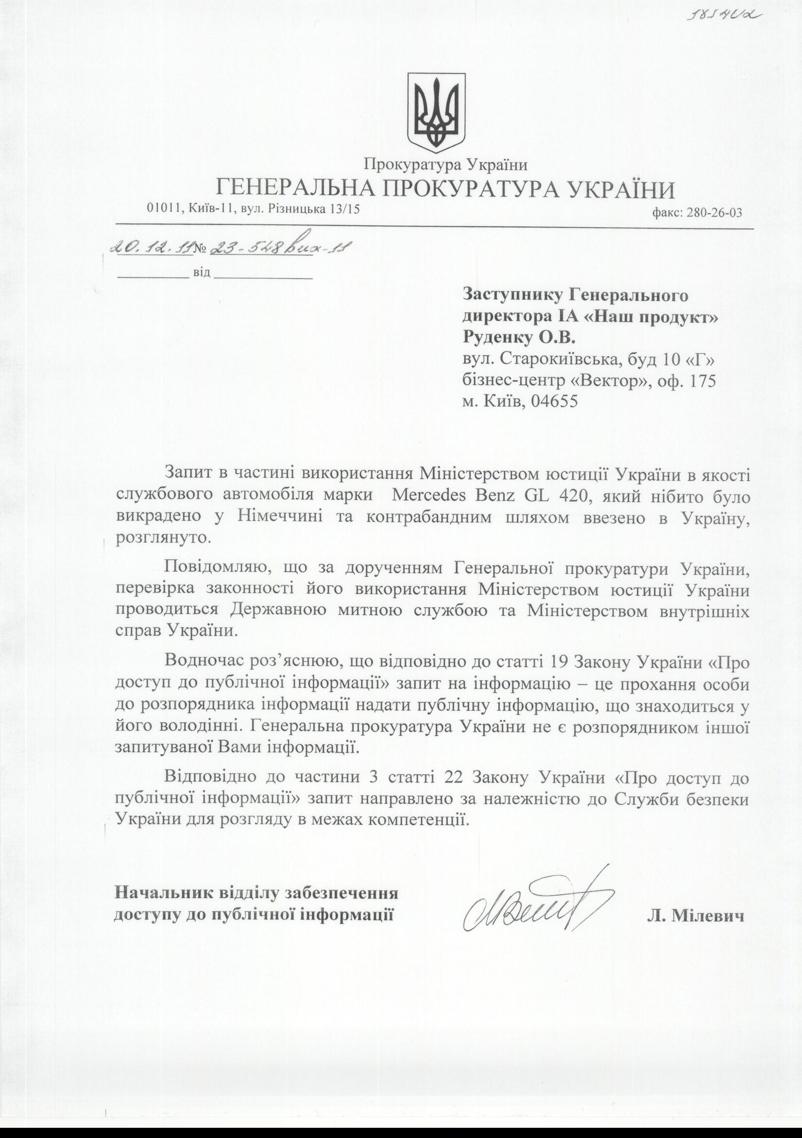 Тем временем, Генеральная прокуратура отреагировала на обращение журналистов, распорядившись провести расследования законности использования Министерством юстиции Украины в качестве служебного авто угнанной в Германии машины (см. ниже фото документа).