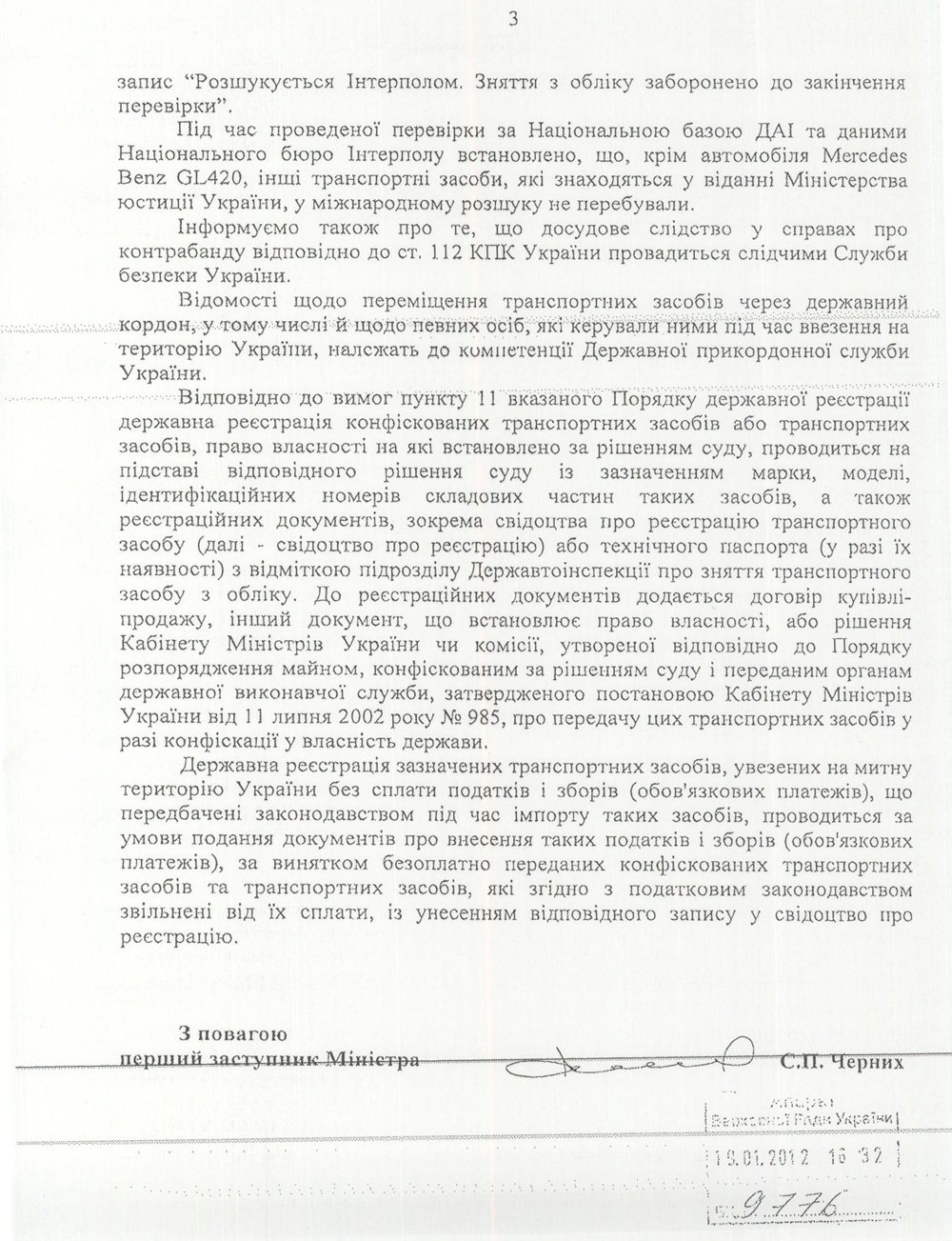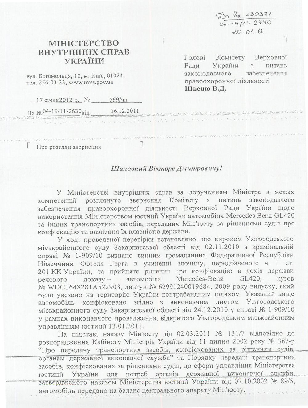 В ответ на обращение главы Комитет ВР по вопросам законодательного обеспечения правоохранительной деятельности Виктора Швеца МВД (в лице замминистра Черных) дало ряд разъяснений по ворованному джипу министра юстиции Украины Александр Лавринович.
