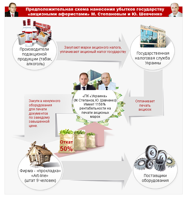 Сумма отката аферистам, как позволяют предположить результаты нехитрых арифметических подсчетов, при этом составит 50%. Фактически, чиновники в открытую грабят государство, половину суммы вкладывая в госбюджет другой страны, а половину – себе в карманы. И это, отметим, при том, что за последние шесть месяцев хирург Степанов и скорняк Шевченко, ничего не понимающие в полиграфии, уже умудрились вытянуть обманным путем из госказны на свои махинации с акцизками более 70 млн. гривен (!). (см.схему)