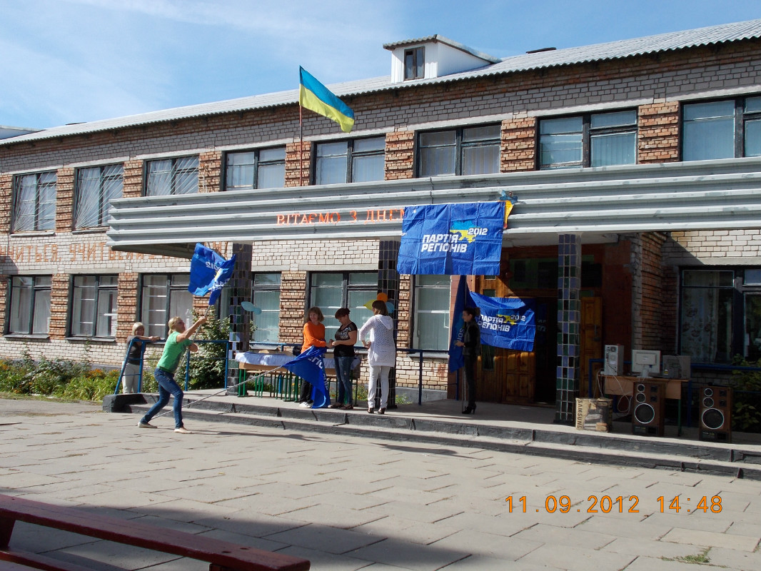 Итак, встречу с кандидатом в Лежино решили провести в 15.00 12 сентября во дворе местной общеобразовательной школы. Организаторы предстоящего действа не просто ждали «высоких» областных гостей, а и тщательно готовились. Еще не успели школьники покинуть здание учебного заведения, как центральный вход в Лежинский учебно-воспитательный комплекс стали украшать баннерами и флагами Партии регионов. Из мощных динамиков, вынесенных во двор, звучали зажигательные ритмы. Одним словом, все происходящее и соответствующий антураж свидетельствовало о приближении какого-то неординарного события или праздника (см. фото).