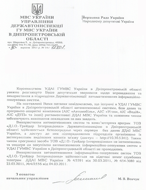 О скандальности деятельности «Д.И.О.» в Днепропетровской области можно судить из переписки народного депутата, заподозрившего в нечистоплотности эту компанию, с руководством областного ГАИ и руководством МВД (см. фото документов ниже). Когда парламентарий попросил чиновников прокомментировать ситуацию с «Д.И.О.», получил два противоположных по смыслу ответа. В первом начальник управления Госавтоинспекции в Днепропетровской области М.В. Вовчук фактически подтверждает, что частная компания получает практически неограниченный доступ к информации, которая размещается на серверах ГАИ и является собственностью государства. В итоге информация с ограниченным доступом выходит за корпоративную сеть МВД Украины и как ею распоряжаются в «Д.И.О.» - неизвестно. Кроме того, использование информационно-поисковых систем «Д.И.О.- Трейдера» осуществляется не на основании договоров, а на основании ряда служебных телеграмм Департамента ГАИ Украины!