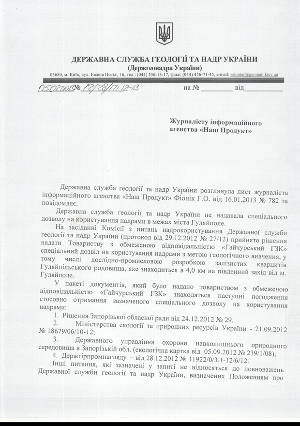 Так, на днях в редакцию информационного агентства «Наш Продукт» поступил ответ на официальный запрос от Государственной службы геологии и недр Украины, в котором, фактически, значится, что структура сняла с себя ответственность за события на землях Гуляйпольского, Приазовского и Приморского районов Запорожской области. Своего рода отговорка звучит приблизительно таким образом: «государственная служба геологии и недр Украины не предоставляла специального разрешения на пользование недрами в пределах села Гуляйполе». В то же время, госгеонедра Украины констатирует, что на соответственном заседании комиссии по вопросам недропользования Государственной службы геологии и недр Украины (протокол от 29.12.2012 №27/12) все же было принято решение - предоставить в пользование геологическими недрами с целью геологического изучения, в том числе с целью исследовательски-производственной разработки… «железистых кварцитов Гуляйпольского рудника» некому ТОВ «Гайчурский ГЗК» (см. документ ниже).