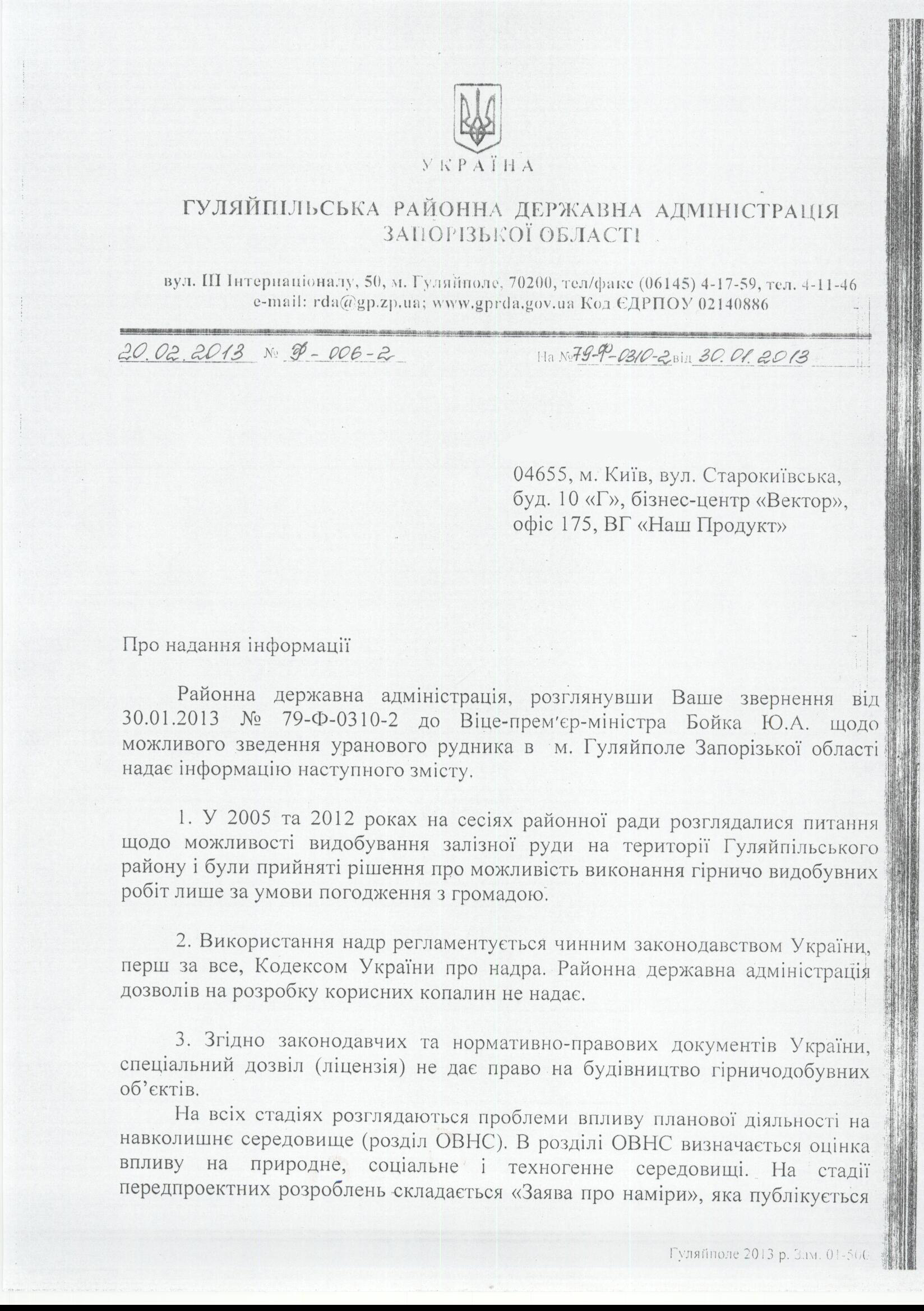 Следующей за госгеонедрами Украины заняла аналогичную позицию, как ни странно... Гуляйпольская райгосадминистрация. В ответе на официальный запрос значится, что в 2005 и 2012 годах на сессиях районного совета рассматривались вопросы относительно возможности добычи железной руды на территории Гуляйпольского района и были приняты решения про возможность выполнения работ. Но – исключительно «при условии согласования с громадой»... (см. документ ниже).