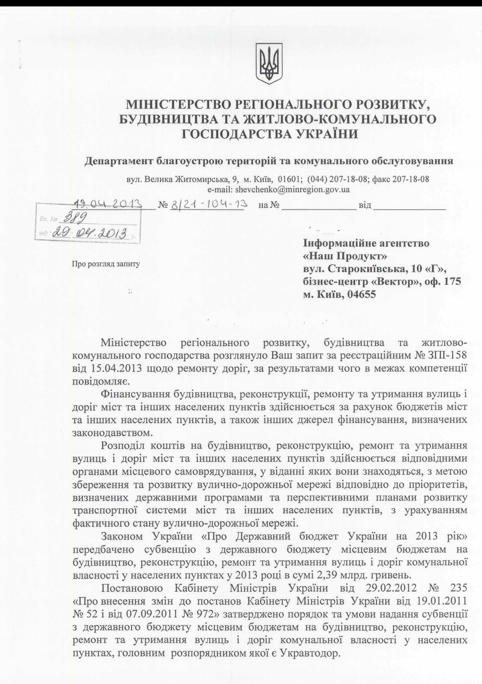 Между тем, в Минрегионразвития сообщили, что в этом году финансирование на ремонт дорог значительно скромнее. Так, согласно ЗУ «О государственном бюджете Украины на 2013 г.» предусмотрена субвенция из госказны местным бюджетам на строительство, реконструкцию, ремонт и содержание улиц и дорог коммунальной собственности в населенных пунктах на сумму всего лишь 2,39 млрд. гривен! Ранее сообщалось, что на эти цели из бюджета потратят 7 млрд грн.