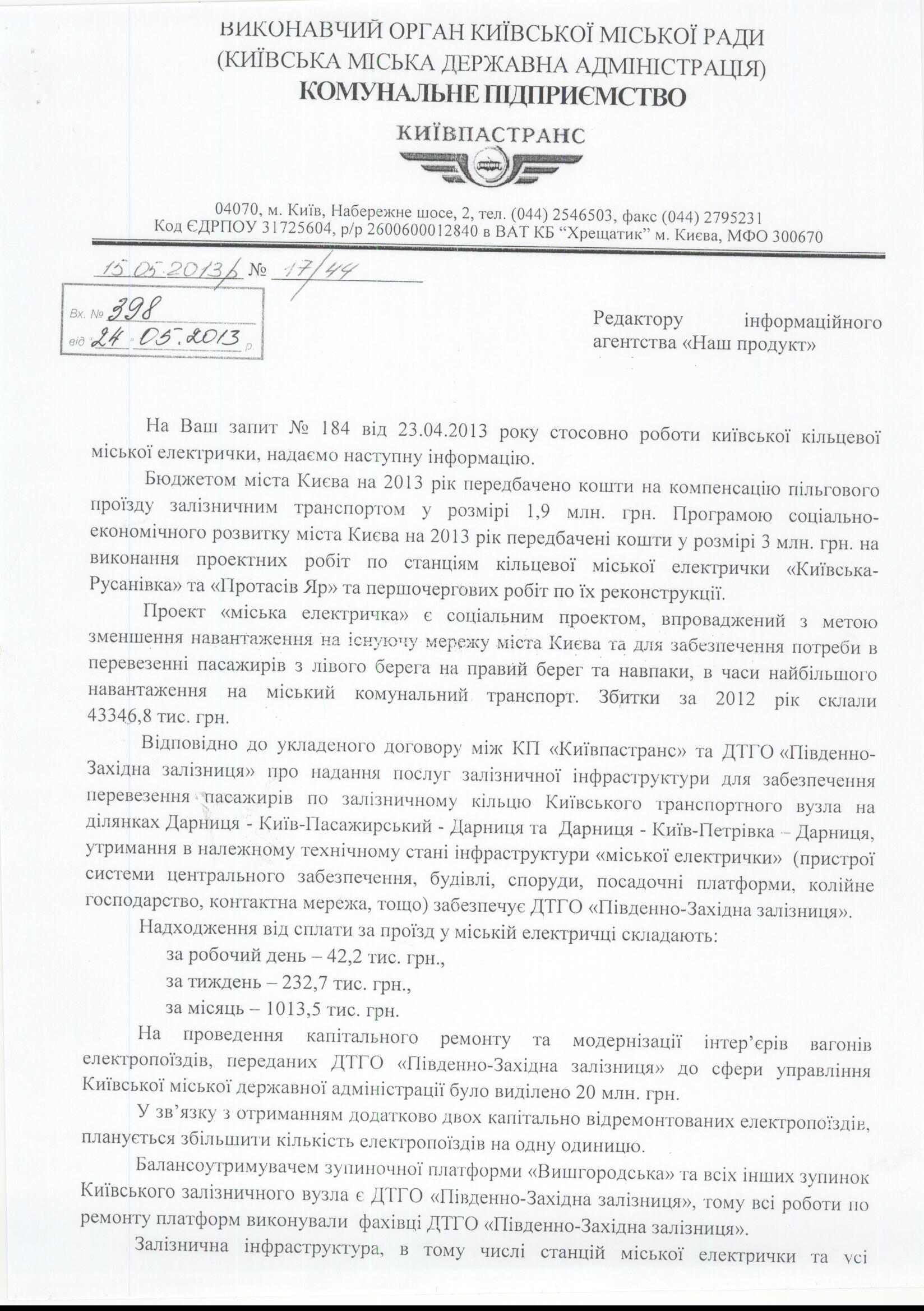 Ответ, который пришлось ждать достаточно долго, традиционно вызвал еще больше вопросов. Одно осталось вне всяких сомнений: проект «Городская электричка», который многие киевляне считают едва ли не единственной здравой идеей местной власти за последних лет 10, является глубоко убыточным. Как отметил в своем письме первый зам генерального директора «Киевпастранса» Алексей Палант, за 2012 год убытки составили 43346,8 тыс. гривен (см. фото документа ниже).