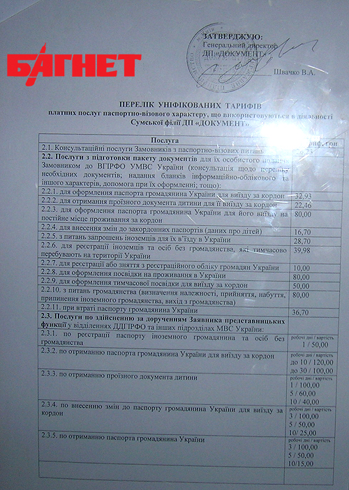 Нет, так нет. Но почему прием граждан в городском паспортном подразделении ведется филиалом ГП «Документ»? По крайней мере, об этом свидетельствовала информация на табло, размещенном в паспортном подразделении (см. ниже фото), под эгидой Сумского филиала ГП «Документ». Здесь и подпись Швачко, который своим росчерком пера с благословения Репешко и Радутного утверждает расценки на различные услуги по линии оформления различных государственных документов, связанных с вопросами гражданства и иммиграции. Мы то думали, что эти расценки утверждаются МВД, Кабмином и т.п. Оказывается, что нет. Есть Швачко, которому надо самому зарабатывать, а еще отстегивать милицейским начальникам Репешко и Радутному.