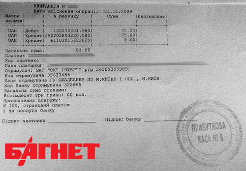 Всего же 10-ти дневное оформление загранпаспорта в Виннице обошлось в 1052,88 грн. Помимо предусмотренных законодательством платежей и уже упомянутой суммы в адрес «Информ-Ресурсы» пришлось оплатить 75 грн. за медстраховку ЗАО «СК «Интер» (см. ниже фото квитанции) и некий платеж в 18 грн. за написание заявления на имя начальника отдела областного ГИРФЛ с просьбой разрешить ускоренное оформление загранпаспорта за 10 дней. Правда, непонятно за что осуществлялся этот платеж, поскольку в кассе объяснили, что квитанции на руки не выдают. Не исключено, что это очередной платеж в адрес швачковских структур ГП «Документ» – просто глубоко законспирированный. Как говорил один из героев известного кинофильма «Операция «Ы или другие приключения Шурика»: «Чтобы никто не догадался!».
