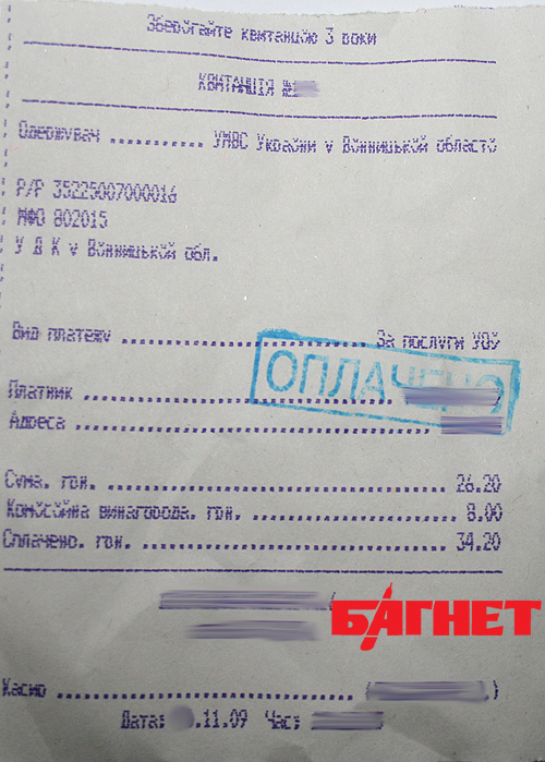 Уже на месте, в кабинете, на дверях которого кроме таблички «Оформление справок о несудимости» не было никаких названий подразделения или предприятия, серьезная женщина активно начала убеждать корреспондента «Багнета», что без этой справки в ГИРФЛ «вам никто паспорт не оформит». Видимых следов деятельности всяческих «ресурсов» не обнаружилось. Тем не менее, когда корреспондент «Багнета» обратился за оформлением справки, то ему предложили оплатить две квитанции – 32 грн. за услуги госпредприятия «Винница-Информ-Ресурси». И еще 34 грн. – собственно в адрес УМВД в Винницкой области (см. ниже фото квитанций). За сколько времени будет сделана справка – нигде не значилось.