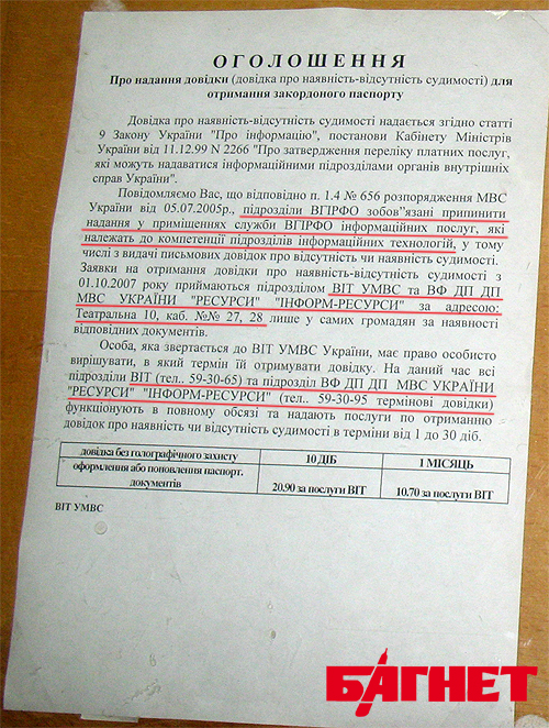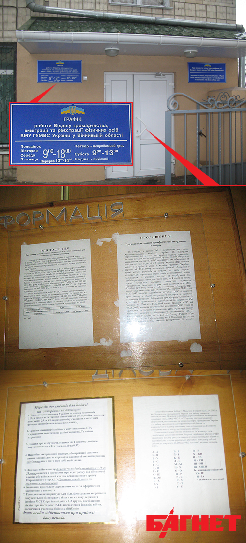 Действительно, на информационной доске подробно рассказывалось о том, что, прежде чем подавать документы на оформление паспорта для выезда за границу, надо обратиться по адресу ул. Театральная, 10!!! в подразделение отдела информационных технологий УМВД и в винницкий филиал ГП «Ресурсы» и «Информ-Ресурсы» (см. ниже фото).
