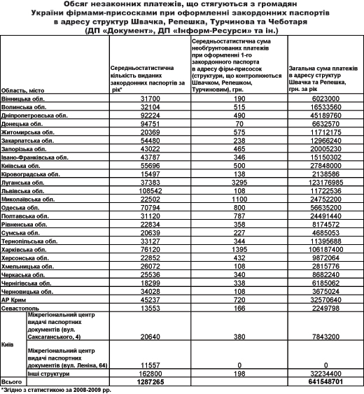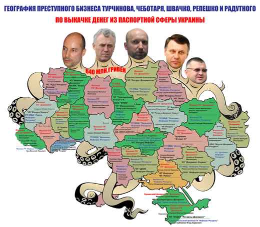 Только по предварительным подсчетам за 2009 год на абсолютно никому ненужных услугах злоумышленники нажились на 700 млн гривен. Хотя по данным парламентария, перед Чеботарем, Радутным и другими паспортными аферистами была поставлена задача передать Турчинову 1 млрд гривен для предвыборной кампании 2010 года.