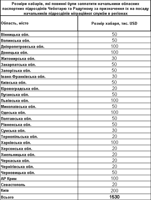 Эта псевдореформа проводилась, в том числе, и для того, чтобы вымогать взятки у руководителей паспортных областных служб (ГИРФЛ) за назначение на руководящие должности в новой структуре – ГМС. В зависимости от региона чиновников «разводили» на $20-100 тысяч (с персональной «таксой» для каждого руководителя службы можно ознакомиться ниже).