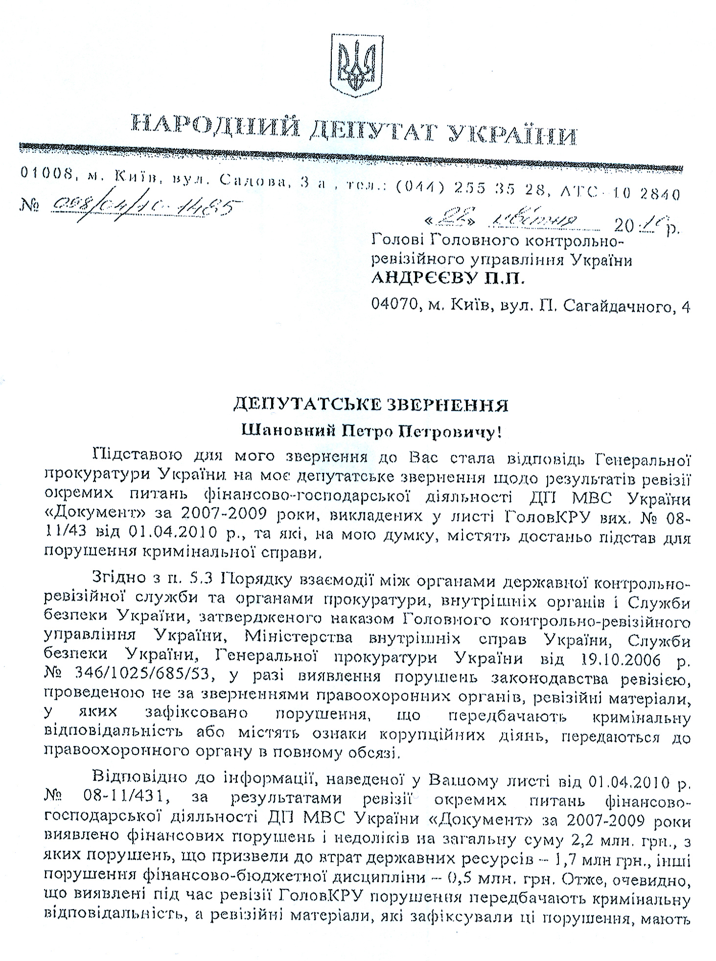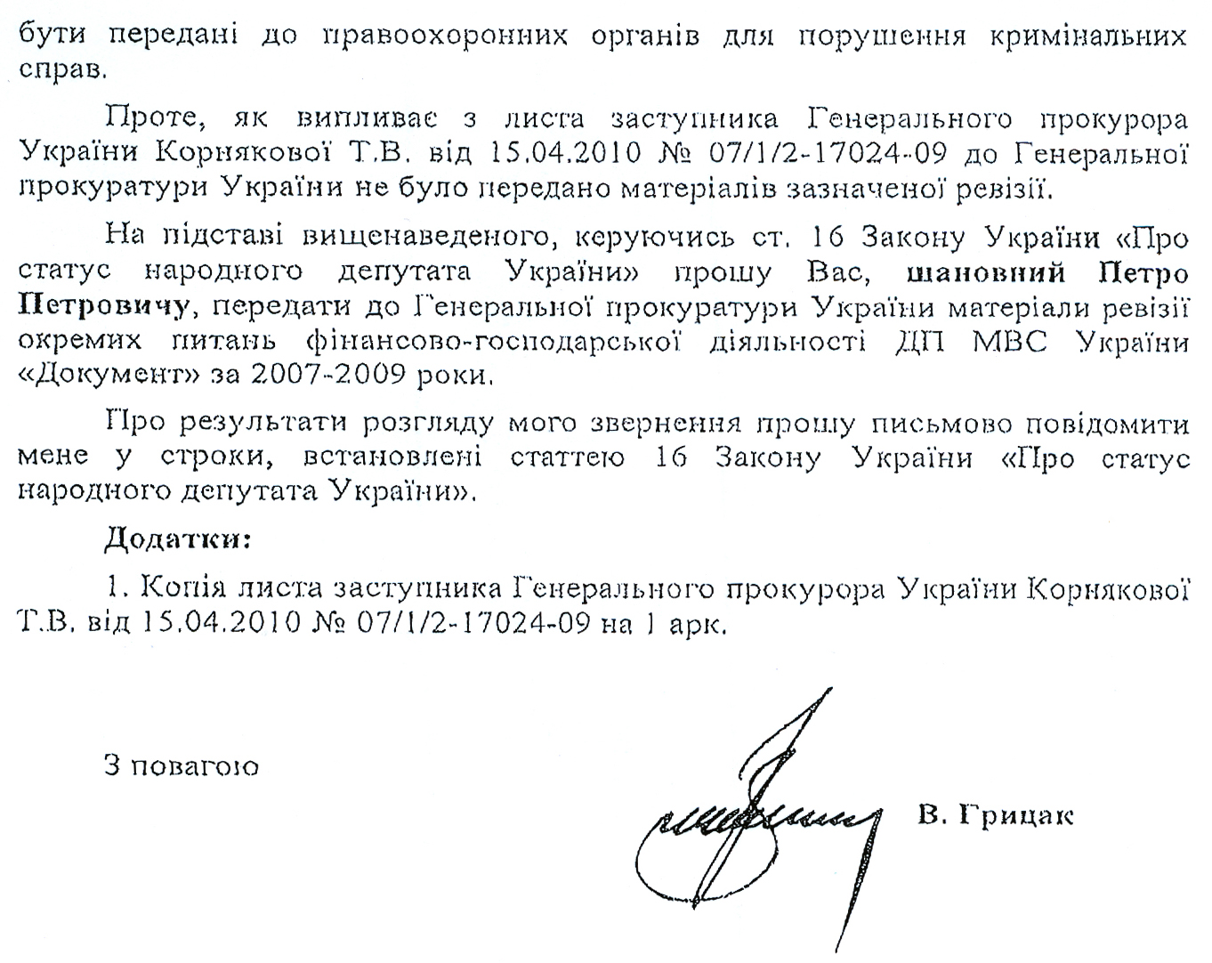В своем письме народный депутат обращает внимание, что после проверки ГлавКРУ финансово-хозяйственной деятельности ГП «Документ» было обнаружено ряд нарушений. По результатам проверки за 2007-2009 года выявлено финансовых нарушений на общую сумму 2,2 млн грн., из них нарушения, которые привели к утрате государственных ресурсов – 1, 7 млн грн., другие нарушения финансово-бюджетной дисциплины – 0,5 млн грн. Народный депутат удивлен подобными фактами: нарушения выявлены, а материалы проверки так и небыли переданы в правоохранительные органы в полном объеме. Тем более что, по мнению Василия Грицака, результаты проверки могут вполне служить основанием для возбуждения уголовного дела.